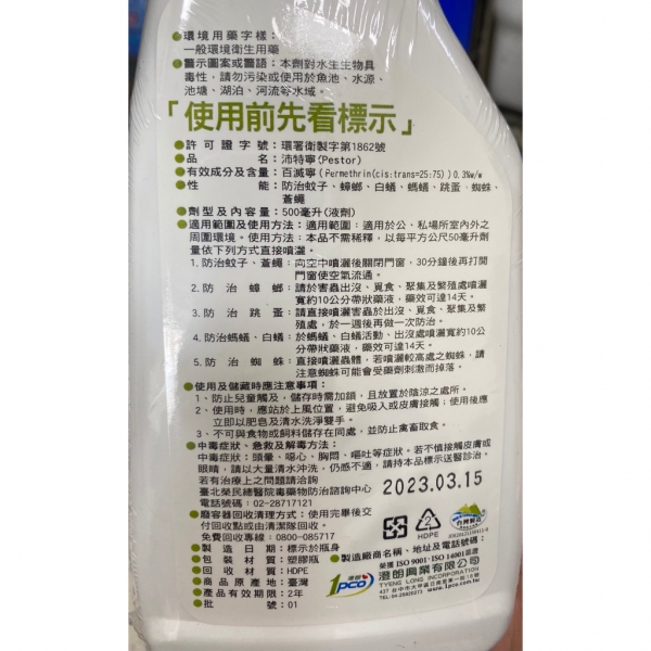 有效成分及含量:百滅寧(Permethrin)........0.3%w/w