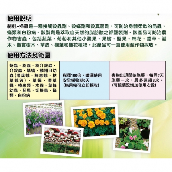 使用方法: 免稀釋噴霧瓶,適合家庭小範圍使用,使用方便,直接噴灑葉面、葉背、枝幹。 濃縮原液:稀釋50~100倍後噴灑使用。 蟲害出現時每隔7天施用一次,連續3次。