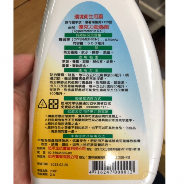 有效成分及含量:賽滅寧(Cypermethrin)........0.50%w/w