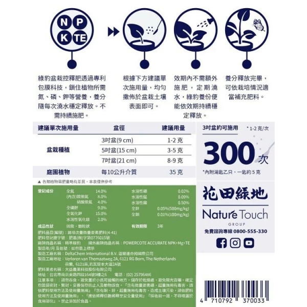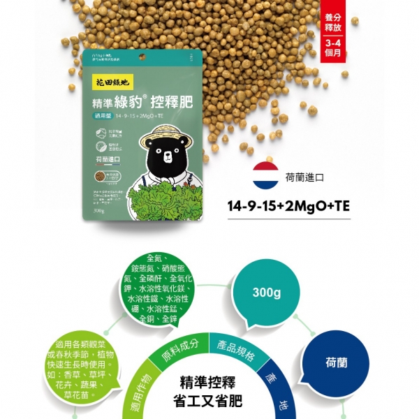 綠豹盆栽控釋肥 - 通用型 300g(養分配比14-9-15+2MgO+TE) 肥料效期2-3個月