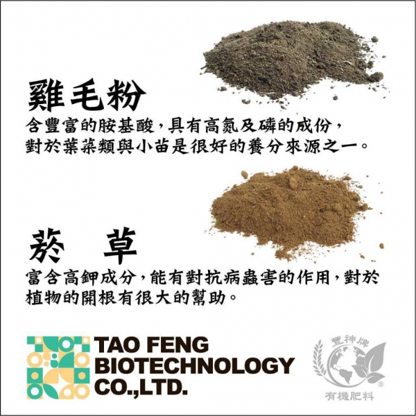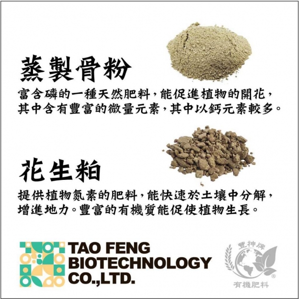 製肥原料及來源:蒸製骨粉、蟹殼粉、花生粕、雞毛粉、菸草