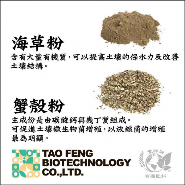 製肥原料及來源:蟹殼粉、雞毛粉、菸草、泥炭、花生粕、海藻粉