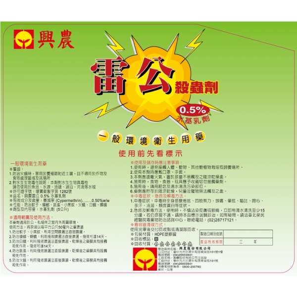 商品名稱:興農雷公殺蟲劑 0.5%水基乳劑 5L