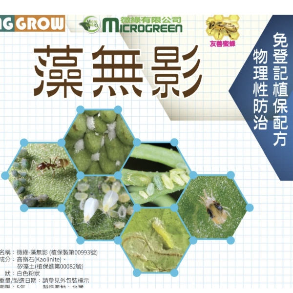 1.物理屏障: 藻無影噴施於植物 表面後, 會形成一層微小的顆粒膜, 阻隔害蟲直接接觸植物, 有效減少咀嚼式和刺吸式口器害蟲的取食, 適用於蟎類、粉蝨、蚜蟲 、薊馬、銹蜱、介殼蟲、潛葉蛾等小型害蟲。