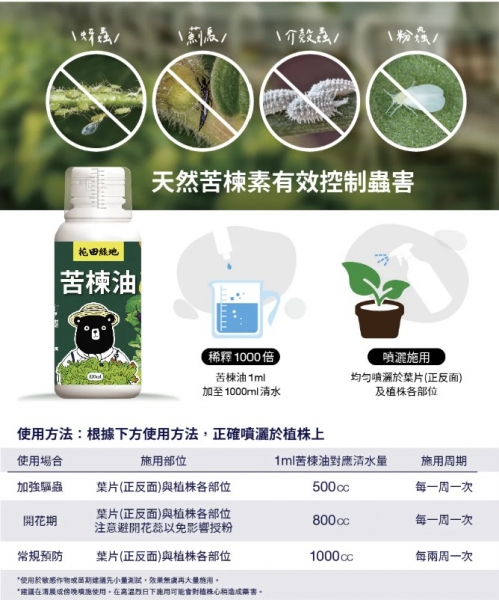 常規預防:葉片(正反面)與植株各部位 1ml苦楝油對應清水量:1000cc 每兩週一次
