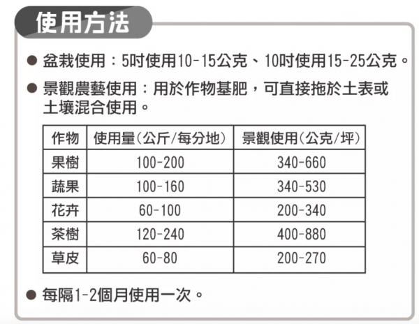 5吋盆10-15克,10吋盆15-25克,均勻撒怖於土壤上,再於表面施於薄土覆蓋即可。每隔1-2個月一次。