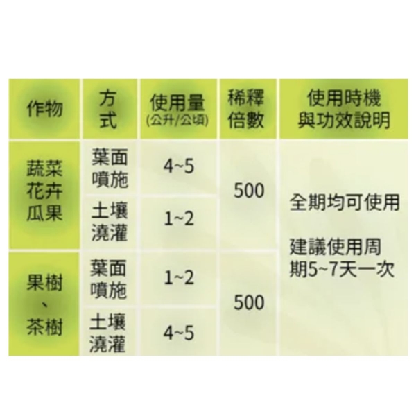 使用量:土壤灌溉:100-300倍、葉面噴灑:300-600倍、種苗培養:800-1000倍。