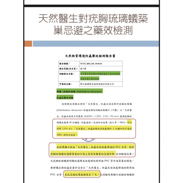 ▶︎經國立彰師大生物系 林宗歧昆蟲博士產學合作,實驗證明有極佳的防止害蟲築巢產卵的忌避效果