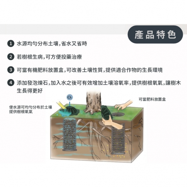使用方法 : 於樹木四周埋3~5支,深度建議30~90cm(依現地之土壤硬度而定),透氣管上緣與地面等高即可