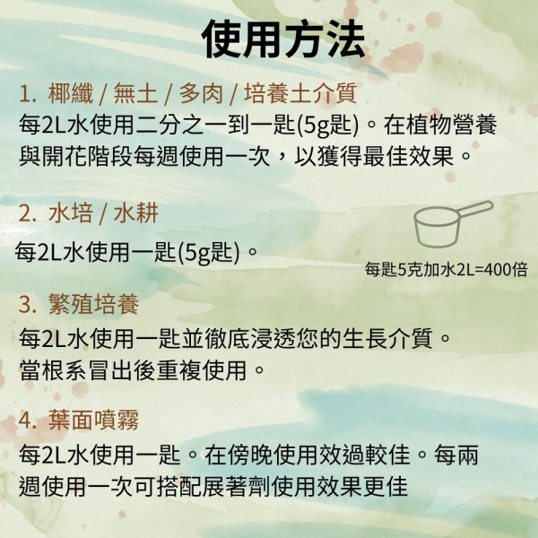 每2L水使用二分之一到一匙(5g匙)。在植物營養與開花階段每週使用一次,以獲得最佳效果。