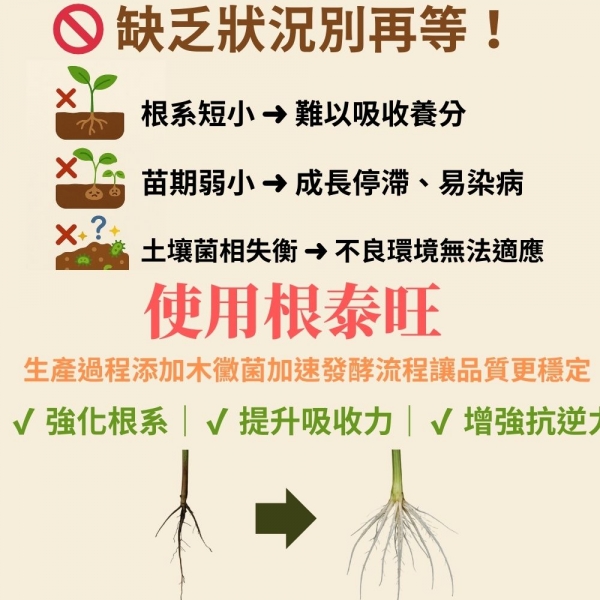 本產品在生產過程中以木黴菌(菌種編號TCT568)作為發酵營養物質,可以讓作物生長強建,在不良環境中有極佳的適應能力,以提供作物的產量與品質。