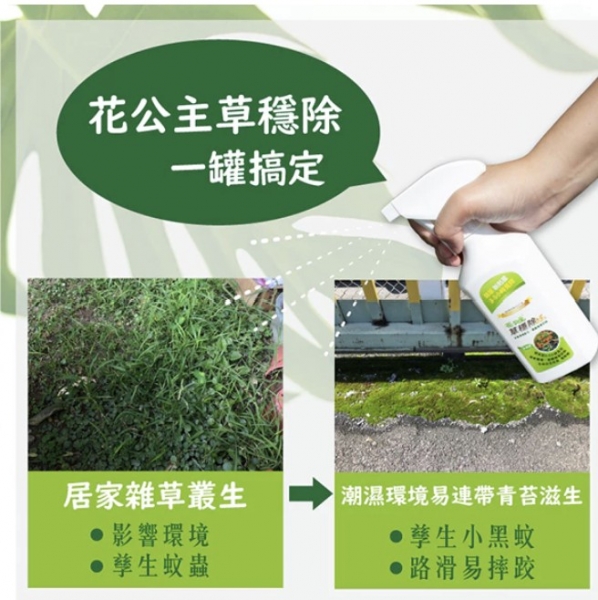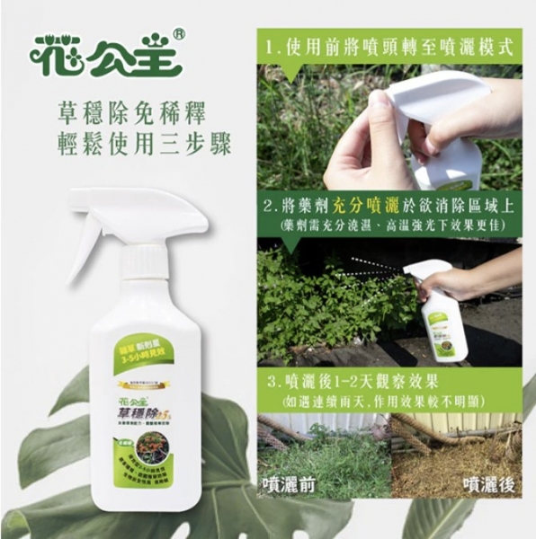 2.將藥劑充分噴灑欲消除區域上(藥劑需衝分澆濕、高溫強光下效果佳)