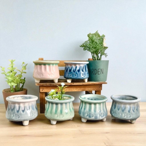 像一顆顆色彩柔和的果凍杯,小巧療癒。盆身環繞可愛魚骨浮雕,搭配三腳設計,既穩固又富層次。整體圓潤討喜,是多肉、小葉植物等完美盆器。