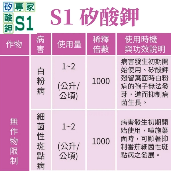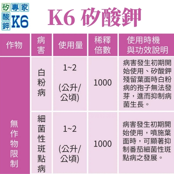 白粉病:葉噴1000倍,病害發生初期開始使用,矽酸鉀殘留葉面時白粉病的孢子無法發芽,進而抑制病菌生長。