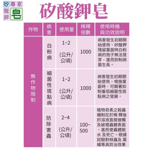 (2)矽酸鉀結合植物皂素可降低產品鹼性,使用上更安全更不易產生藥害。